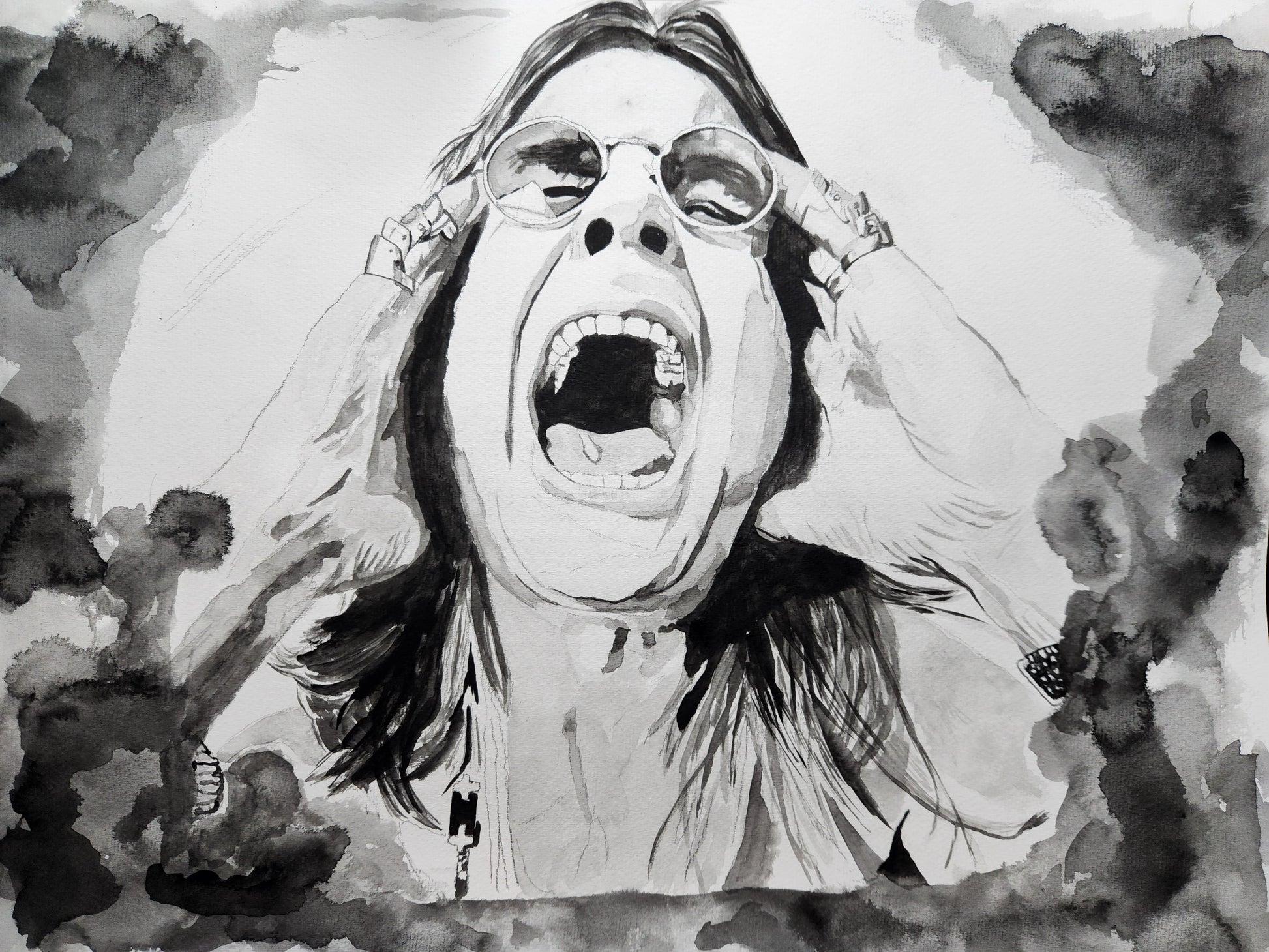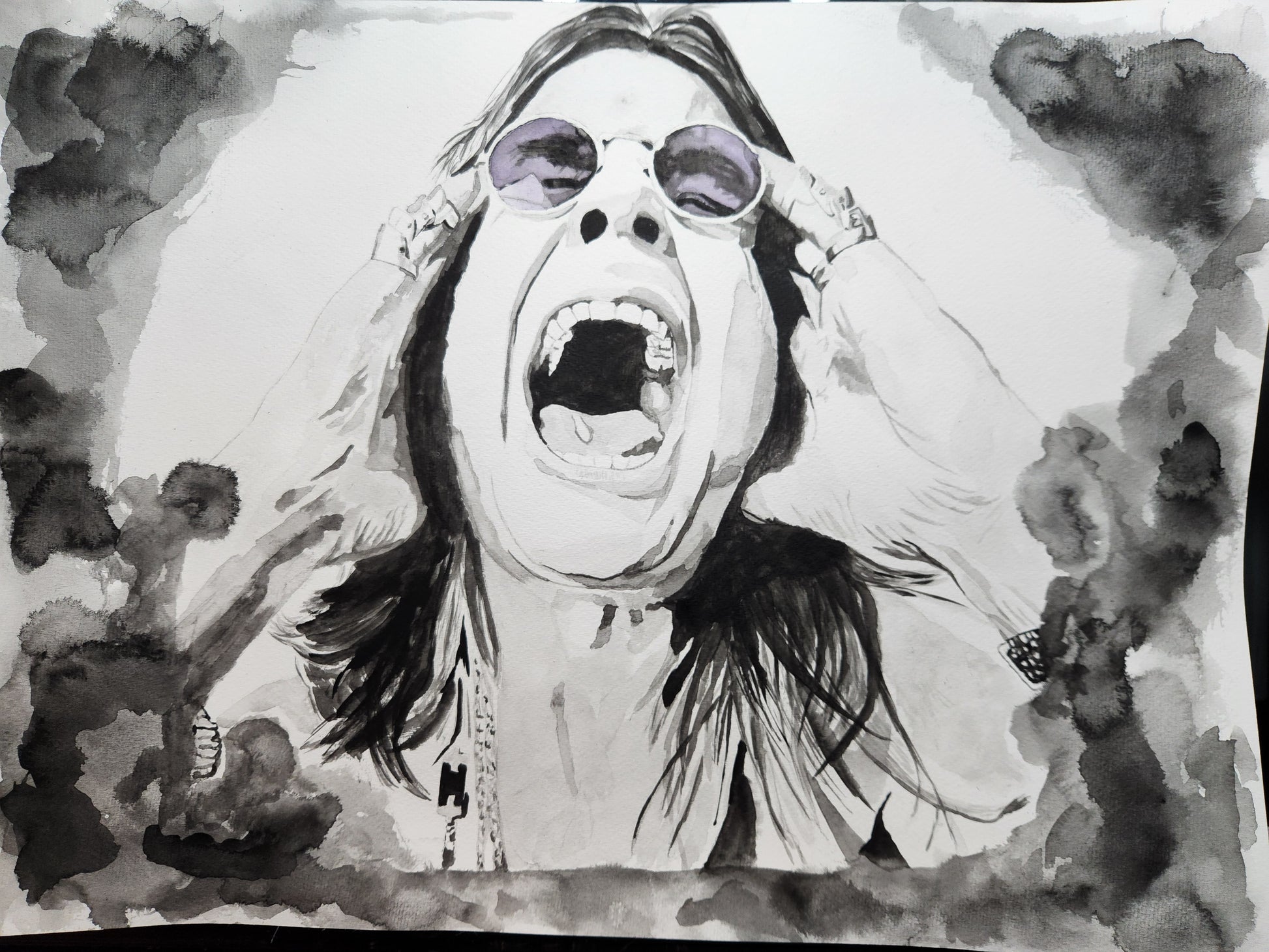 This raw and electrifying black and white watercolor captures Ozzy Osbourne in his purest form—unleashed, defiant, and larger than life. The wide-open scream, iconic shades, and chaotic brushstrokes frame the Prince of Darkness in a moment that feels alive with the energy of rock itself.